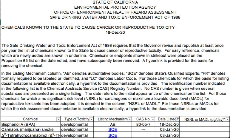 California Prop 65 List Update
