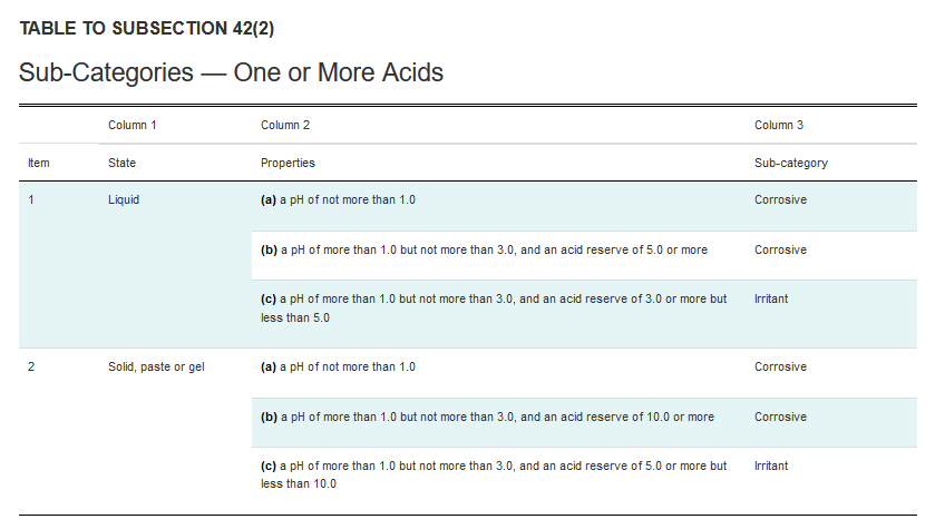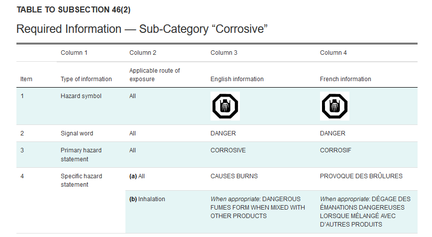 As you can see from this example, the regulations advise of the requirement for an acid reserve to determine the classification. If you have then determined based on your assessment that the product is considered Corrosive under the CCCR criteria, there is another chart that they provide showing you the symbol requirements, signal word, primary hazard statement, specific hazard statement, negative and positive instructions, first aid statements etc.