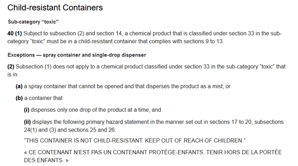 The Canadian Consumer Chemicals and Containers Regulations, 2001 (CCCR, 2001) contains some of the regulations that we must follow when classifying, packaging, and labeling a non-registered hazardous product for Canada. Note that I say some. There are many other requirements that go into properly packaging a product for sale in Canada.