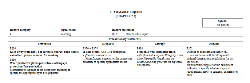 A product with the GHS phrase Combustible liquid lands in Category 4. Under the HPR, you will see the parameters here: