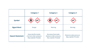 Each category has required symbols, signal word and hazard and precautionary statements: