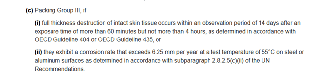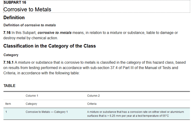 Products that are corrosive to metal must be classified as such under the Hazardous Products Regulation. This classification also exists for shipping within Canada. This classification DOES NOT exist for the CCCR, 2001.