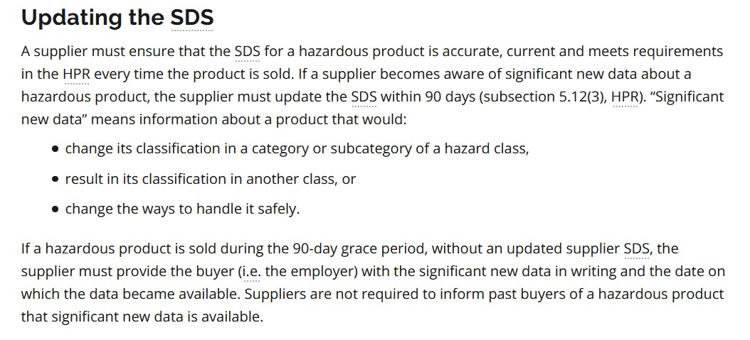 When looking into the Ontario regulations, they state this as well. As per the information available online, this is what the Province of Ontario has to say regarding updating your SDS: WHMIS and the Supplier.