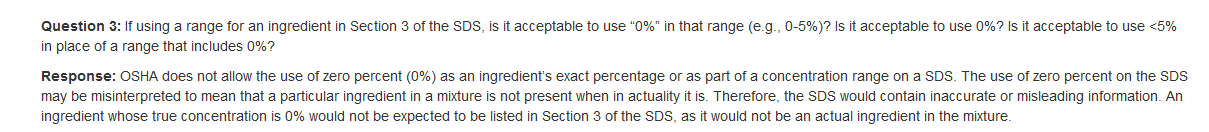 Please ensure that you know what components are within your product so the proper disclosure of chemicals can occur within this section. As you can see from the above picture, OSHA does NOT allow the use of Zero Percent.