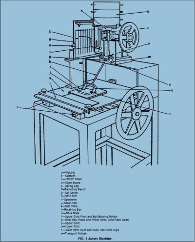 The James Machine is used to determine the static coefficient of friction of a surface, through repeated testing. The static coefficient of friction is “the ratio of the horizontal component of force applied to a body that just overcomes the friction or resistance to sliding, to the vertical component of force applied” (ASTM Designation: D2047-11).