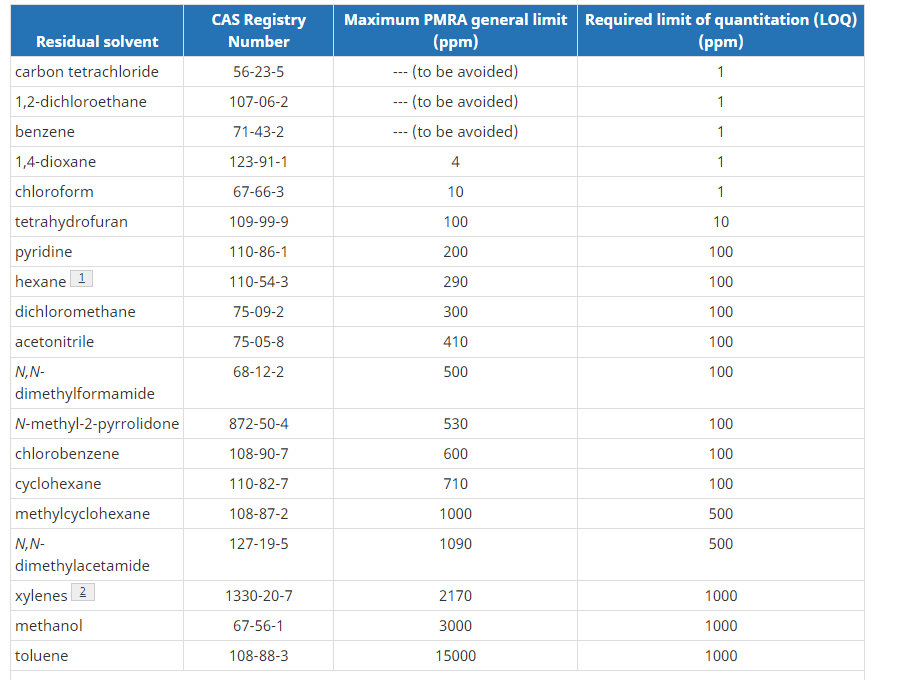PMRA-Established Limits for Residual Solvents