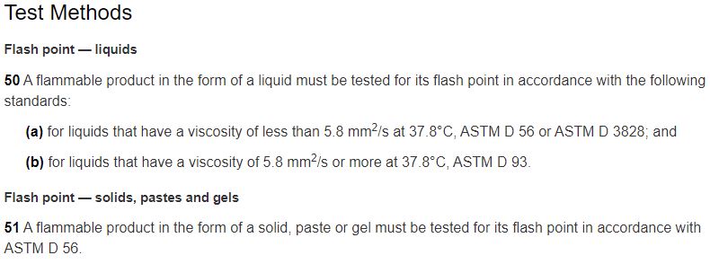 In the CCCR, you’ll see that the flash point method to be used in testing liquid products is determined by the viscosity of the liquid. Samples with a viscosity less than 5.8 mm2/s at 37.8°C are tested with ASTM D56, and liquids with a viscosity of 5.8 mm2/s or more at 37.8°C are tested with ASTM D93. Learn more about ASTM D56 and ASTM D93 here.