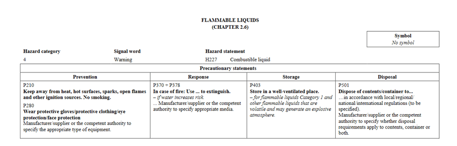 At this point in time, there are some classifications that do not need a symbol. If we look at the requirements for a hazard category 4 under flammable liquids, you’ll notice that there are statement requirements but no symbol requirement.