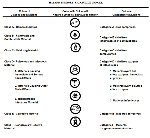 The terminology WHMIS (Workplace Hazardous Information System) symbols and pictograms seems to be thrown around out there so let’s dive a little more and help clarify the confusion. When we referred in the past to WHMIS symbols, they were indicative of the older WHMIS 1988 hazard symbols which were found in Schedule II of the Controlled Products Regulations (CPR). If you’ve been in the business of chemical regulations in Canada for many years, you’ll remember that these symbols were circular, black and white, and they were used for Class A through Class F. The label was enclosed within a demarcated hatched border. Within the symbol was a picture that was indicative of the classification.